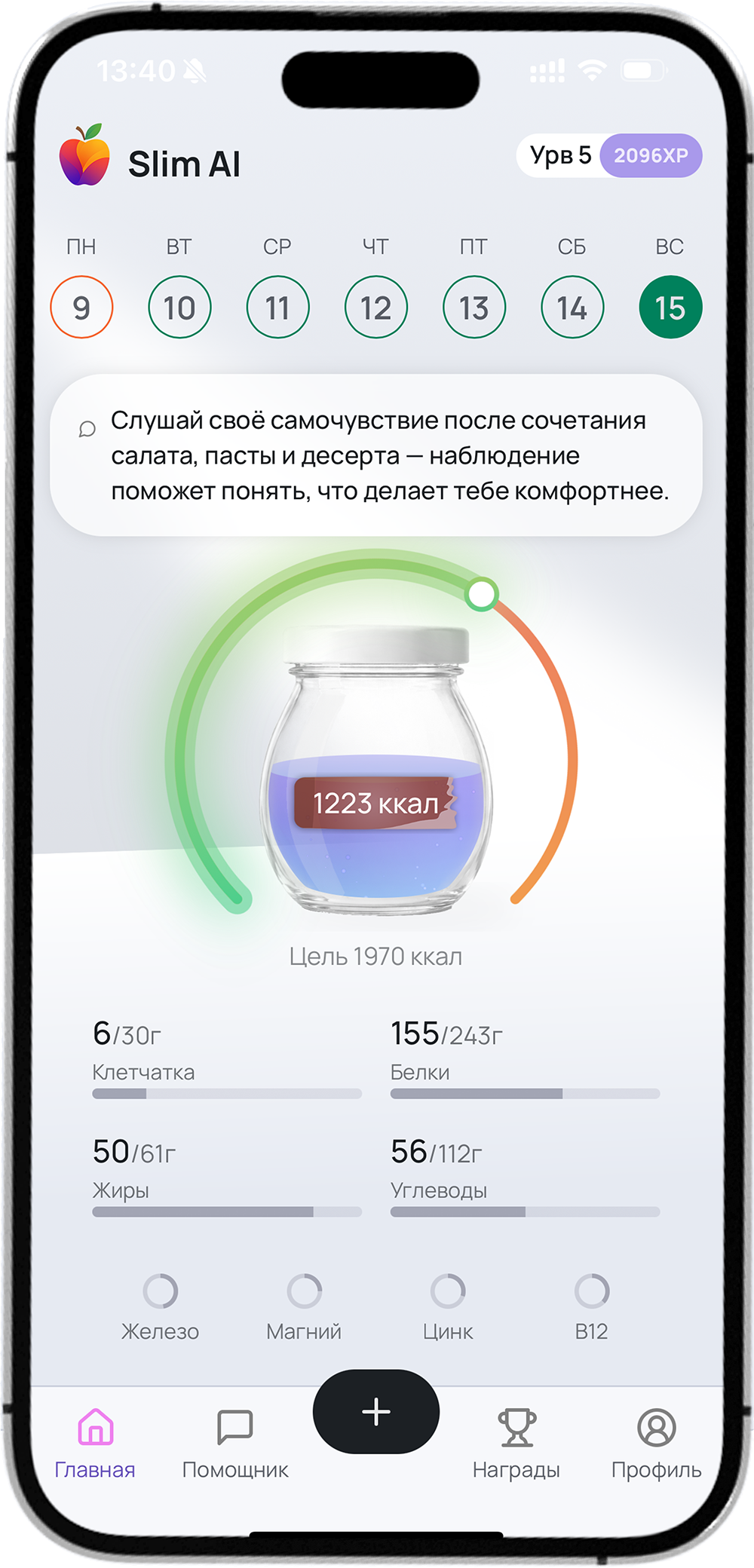 Slim AI автоматически считает калории и КБЖУ, ведёт дневник питания и показывает аналитику рациона.